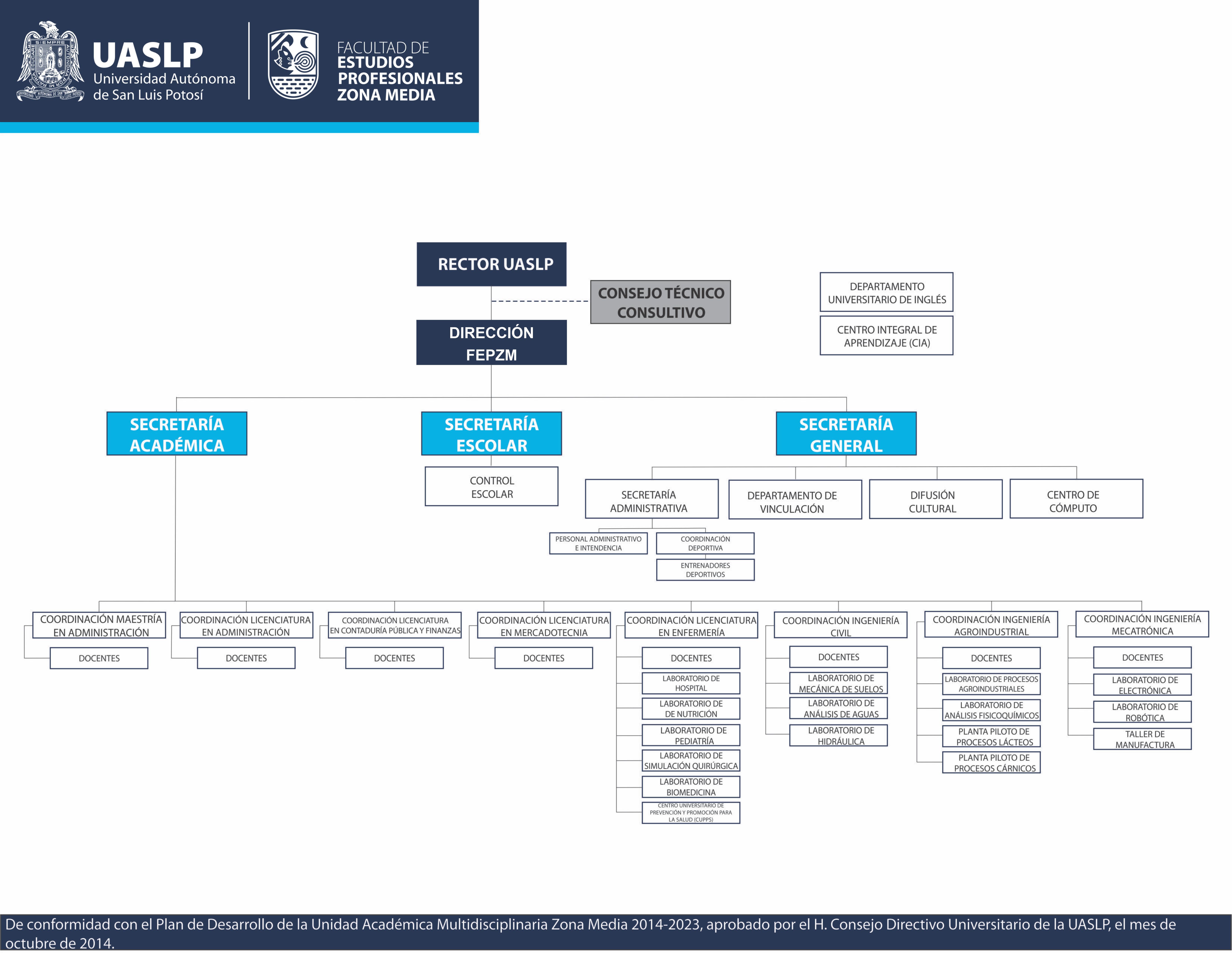 La Facultad de Estudios Profesionales Zona Media es una entidad académica de la UASLP, que se rige bajo los lineamientos del Estatuto Orgánico Universitario. La dirección y liderazgo de la entidad, se encomienda a un director que es designado por el HCDU.